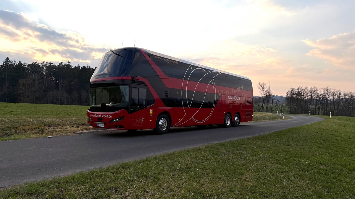 Doppelstock-Fernreisebus mit Glasdach, 80+1+1 rückwärts und seitlich verstellbaren Schlafsesseln mit Fußstützen und Armlehnen, großem Sitzabstand, 2 vis-á-vis-Sitzgruppen im Unterdeck, Bordküche mit 2 Kaffeemaschinen, Würstchenkochen, 3 Kühlschränken, leistungsstarker Klimaanlage, Navigations-, Radio-, Mikrofon, CD- und DVD-Anlage, Bordtoilette und großem Kofferraum.